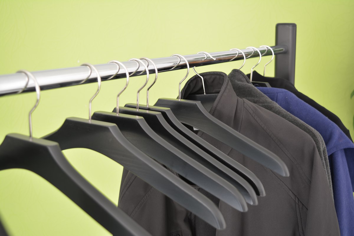ubrań na drewnianych wieszakach szafowych.