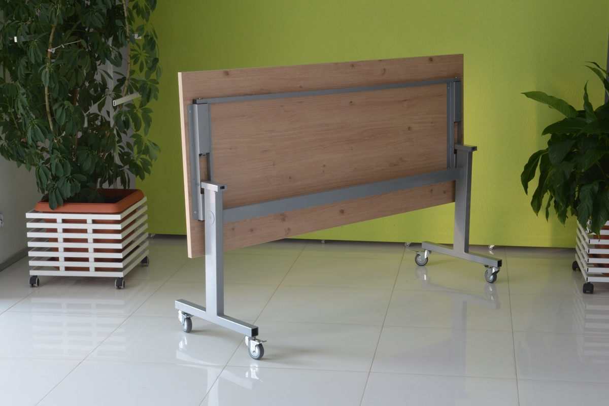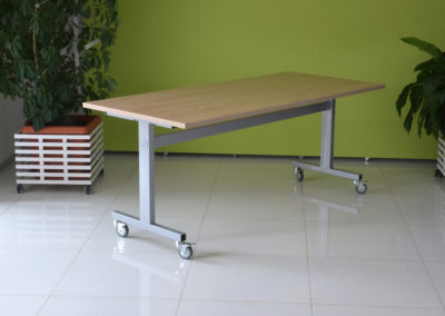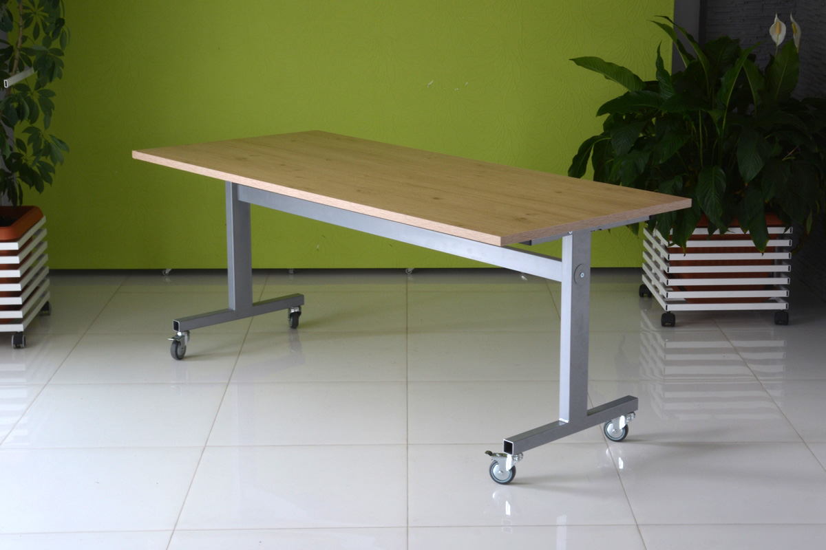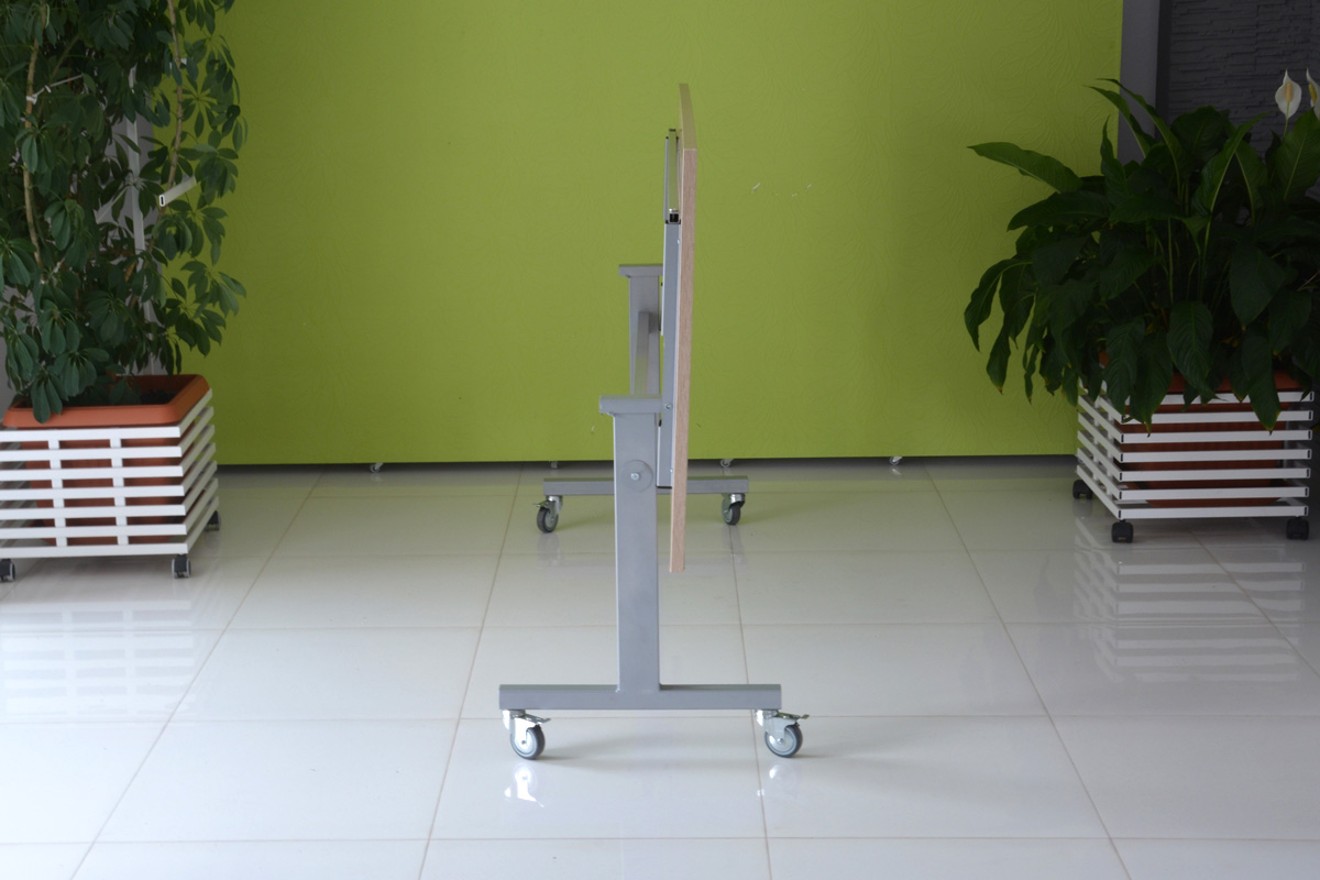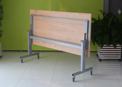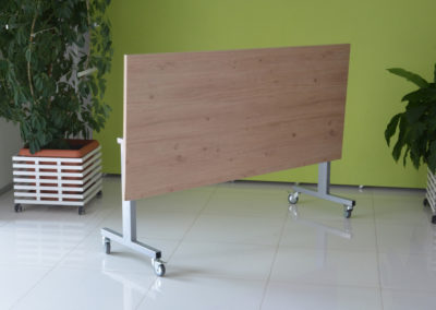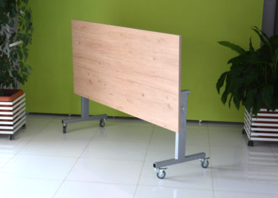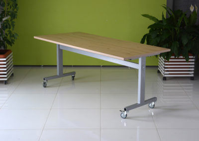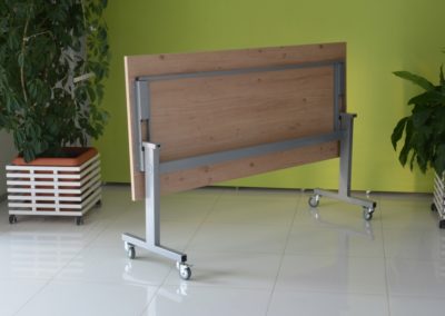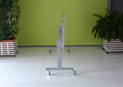 Praktyczna konstrukcja mobilnego stołu z odchylanym blatem to nasze stoły uchylne. Solidna, wytrzymała konstrukcja ze stali malowanej proszkowo na kolor czarny lub metalik nosi klasyczny blat o wymiarze dopasowanym do potrzeb klienta w bogatej palecie wybarwień.