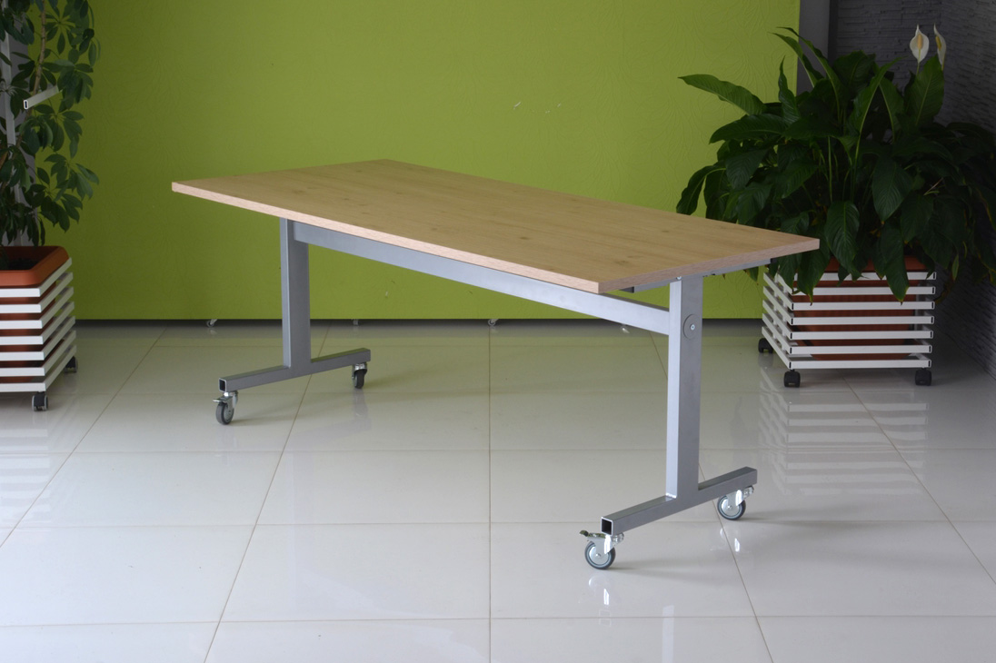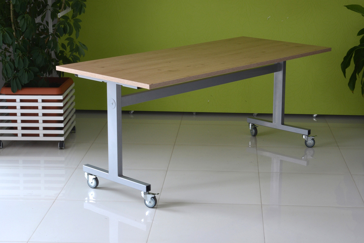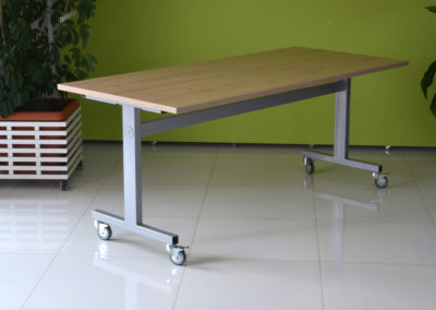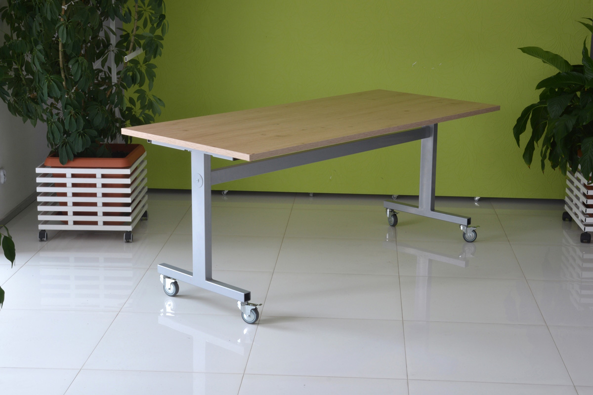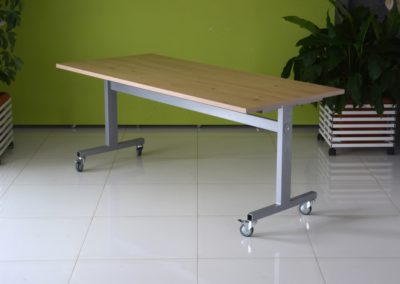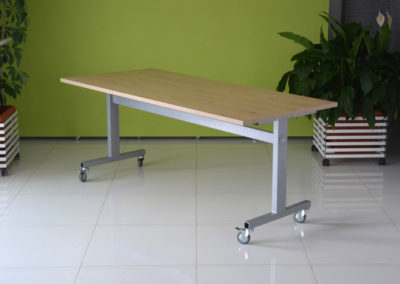 Praktyczna konstrukcja mobilnego stołu z odchylanym blatem to nasze stoły uchylne. Solidna, wytrzymała konstrukcja ze stali malowanej proszkowo na kolor czarny lub metalik nosi klasyczny blat o wymiarze dopasowanym do potrzeb klienta w bogatej palecie wybarwień.
